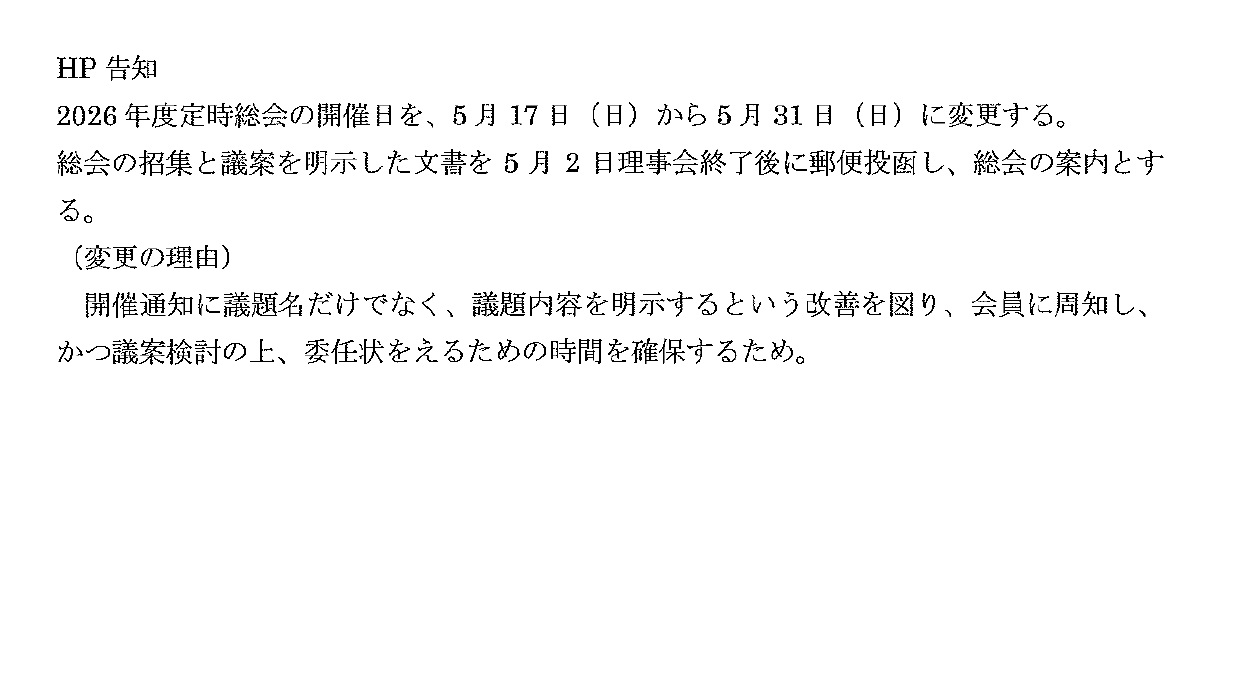トップお知らせお知らせ2026年度定時総会開催日変更のお知らせ